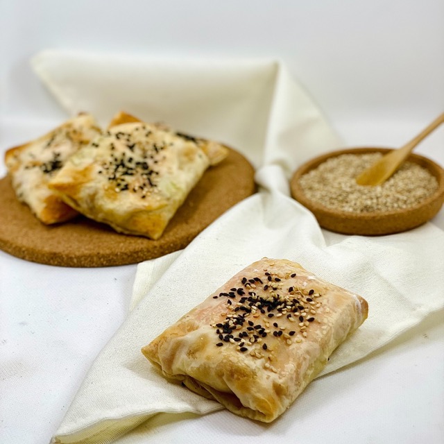 - Stendi un foglio di pasta fillo e spennellalo leggermente con l’olio (oppure usa acqua per una versione più leggera);